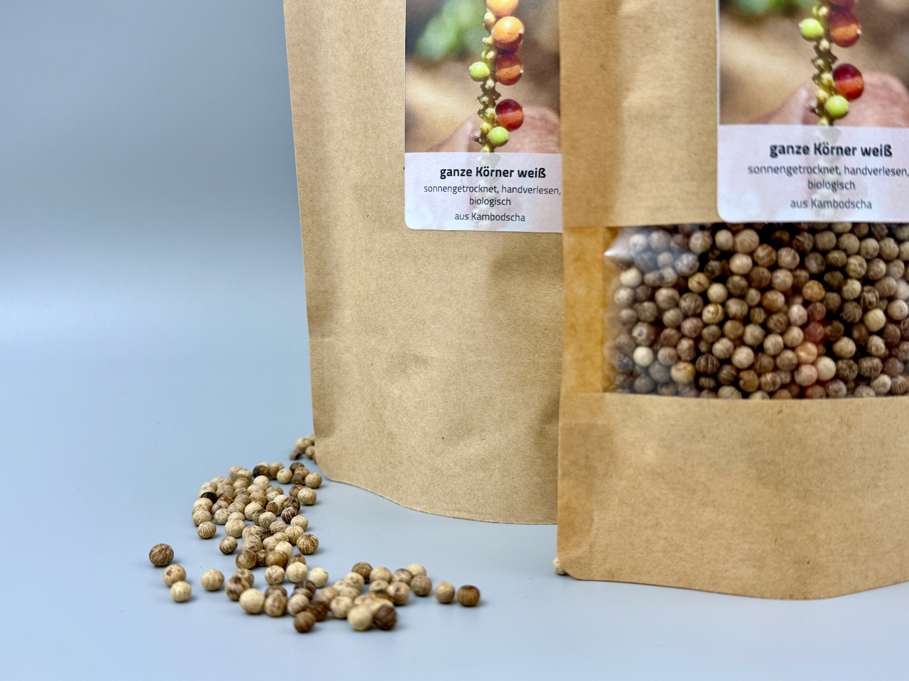 Unser Pfeffer wird direkt nach der Ernte in Kambodscha sorgfältig ausgewählt und für den Transport nach Deutschland vorbereitet. Hier angekommen, verpacken wir ihn von Hand – mit derselben Sorgfalt, mit der er geerntet wurde.